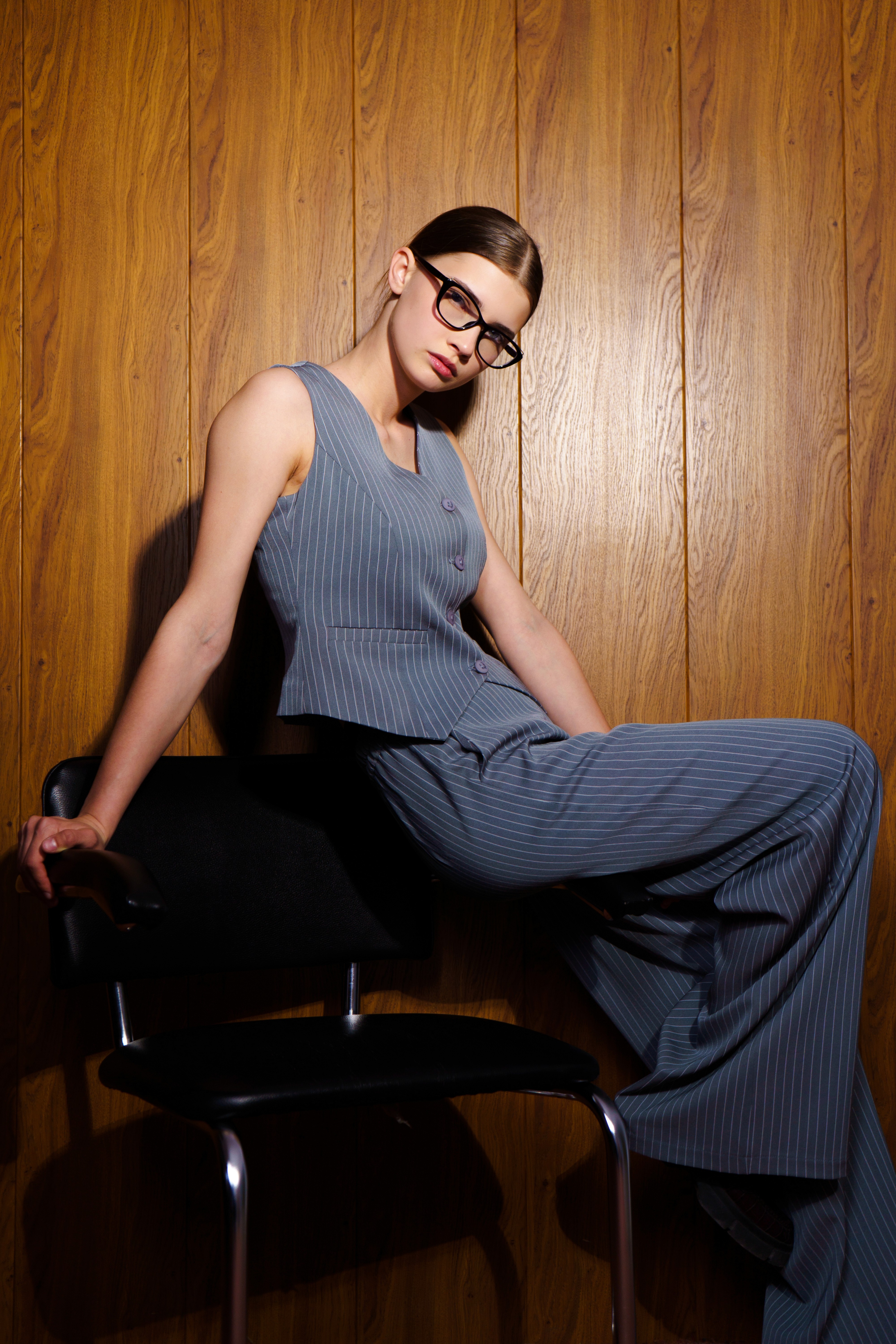 Костюм-тройка в классическую полоску — манифест безупречного стиля и амбиций. Глубокий серо-голубой оттенок и строгая геометрия линий создают образ, который не нуждается в представлении. Жилет с острыми углами и свободные брюки формируют динамичный силуэт, подчеркивающий статус и уверенность. Это инвестиция в гардероб, которая работает на вас. Сочетание строгости и маскулинности делает этот комплект идеальным решением для важных переговоров, выступлений или создания эффектного образа в стиле "Power Dressing"